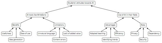 The students’ responses to this activity were analyzed with a qualitative discourse analysis methodology []. The analysis involved manually coding the students’ written opinions using ATLAS.ti software []. We set, a priori, four main categories based on the prompts given to the students: benefits and limitations of AI tools similar to WriteSonic, and advantages and risks of the use of AI in their field. Based on these, the coding process yielded a larger set of a posteriori codes, which describe the most common concepts expressed by the students. This descriptive coding [] gave us a second approach to the students’ feelings, which complemented the quantitative analysis.