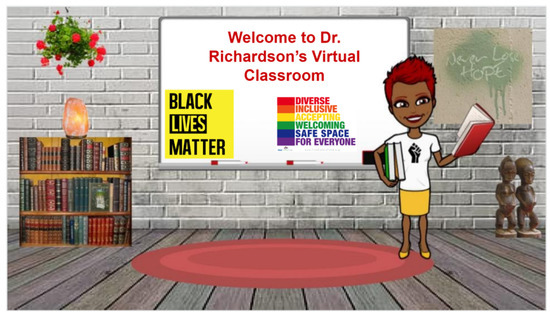 I feel it is important to be culturally responsive to meet the diverse needs of all students (kindergarten through college, traditional and nontraditional students) from different backgrounds, as all course environments are diverse, even those that appear to be phenotypically similar. The picture of the virtual classroom I created during the COVID-19 quarantine is an example of how I show that all students are welcome (Figure 1). Teachers who are culturally responsive get to know their students, work to understand their cultural backgrounds, and find ways to incorporate their cultural and lived perspectives and experiences with course content [17]. They focus on student learning (as opposed to grade-focused achievement), cultural integration, social justice, and indigenous language revitalization. This is salient because research shows that how students encode, think, and process information is connected to cultural nuance, transmission, and preference [11,17,18]; and these needs do not end at the culmination of high school.