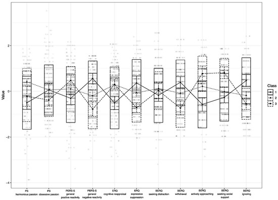 Visual representation of the three-profile solution (varying variances, varying covariances) with the standardized results. Note: PS = Passion Scale; PERS–S = Perth Emotional Reactivity Scale–Short Form; ERQ = Emotion Regulation Questionnaire; BERQ = Behavioral Emotion Regulation Questionnaire.
