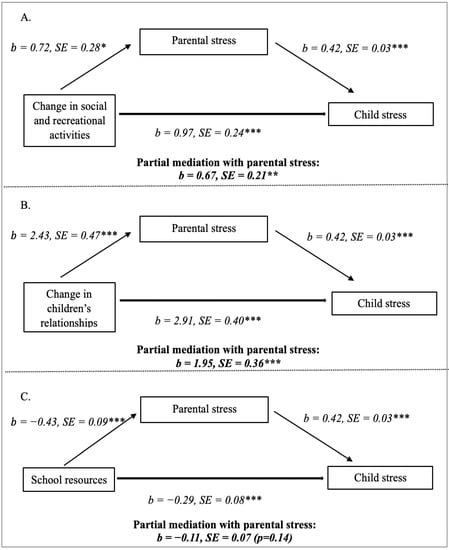 Mediation models relating social, recreational, and educational measures, parental stress, and child stress. Note. (A) demonstrates that parental stress partially mediates the relationship between the change in social and recreational activities and child stress during the pandemic. (B) shows that parental stress partially mediates the relationship between the change in children’s relationships and child stress. (C) illustrates that parental stress fully mediates the relationship between school resources and child stress during the pandemic. Standardized coefficients and standard errors are shown. * p < 0.05, ** p < 0.01, *** p < 0.001.
