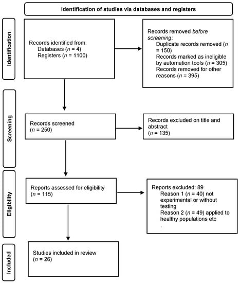A total of 115 initial studies were reviewed, taking into account the inclusion and exclusion criteria. After the full-text screening, 89 studies did not meet the inclusion criteria and were removed. The 26 remaining studies were included in the final analysis. Figure 1 depicts the process and the results of the research strategy.