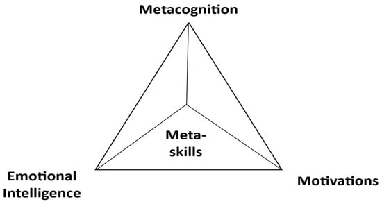 Emotional intelligence refers to the objective perception, evaluation, and expression of emotion in oneself and others, the effective regulation of emotion in the self and in others, and the deliberate employment of positive feelings with the aim to increase internal motivation, thus ensuring optimal performance [52,53,54]. According to this study’s view, emotional intelligence, metacognition, and motivations are three interrelated concepts that provide the ground for meta-skills development (Figure 2).