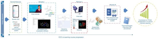 Chemistry teachers usually organise their time between school assignments and continuous training. In this sense, it is necessary to design e-learning courses structured using brief modules focusing on scientific topics relevant to the school environment [19]. Additionally, some studies highlighted the necessity of providing teachers with training on effectively utilising technological tools to enhance their pedagogical practices. This training is because teachers typically have a minimum academic background regarding digital technologies, and even less so in the context of chemistry education. Consequently, their use of digital technologies is not frequently incorporated into their pedagogical practices [20,21].