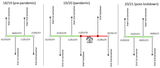 As can be seen in Figure 1, the studied lessons covered the following academic years: 2018–2019 (pre-pandemic), 2019–2020 (including lockdown) and 2020–2021 (post-lockdown).