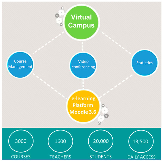 Virtual campus (VC) is an online service for teaching support and dissemination of the materials available in each teaching area that is provided by the UCA to teachers and students (Figure 2) [28].
