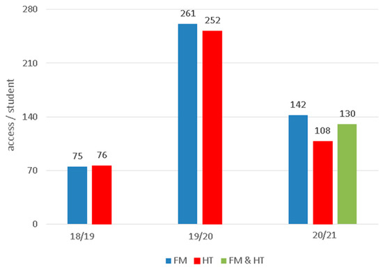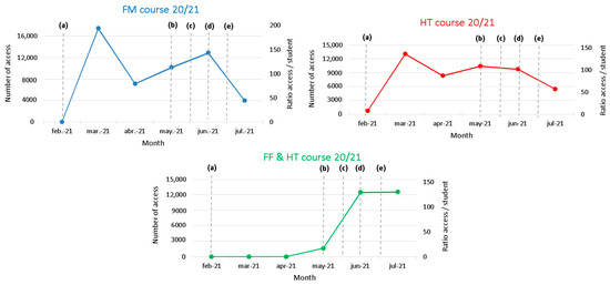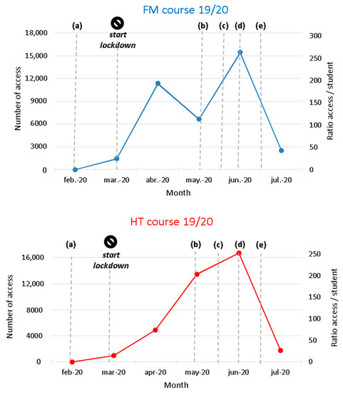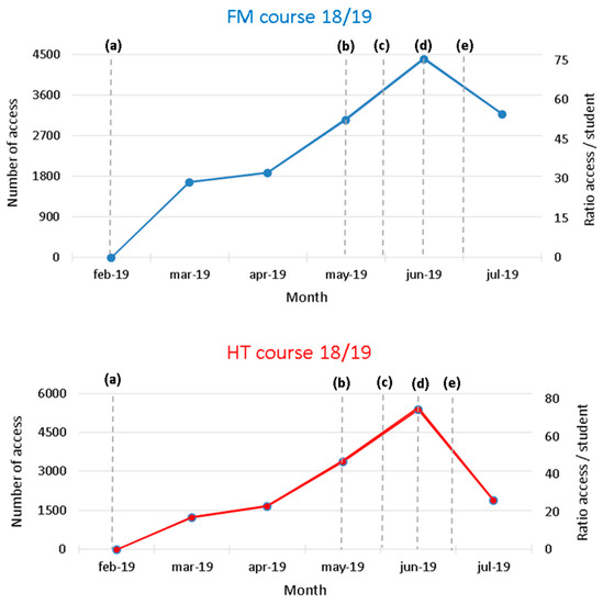 Figure 5 shows the evolution of the access number to VC during the year in both courses. In particular, an increase in visits took place from the beginning of the experimental lessons until practically the end of the course. Although the HT course had a higher number of visits, the accesses/student ratio is very similar in both courses and also has the same pattern of evolution. Thus, we can observe an increase in visits during the empirical lessons, mainly due to the downloading of information and the sending of reports. The maximum number of visits per student and month was very similar in FM and HT, of 75 and 76, respectively.