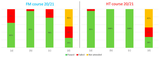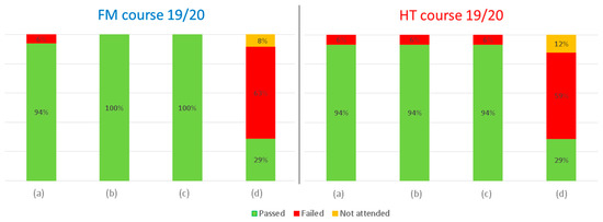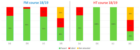Student passed and failed the FM and HT courses during the 2018–2019 academic year. (a) Written exams; (b) final reports; (c) experimental lessons; (d) global course.