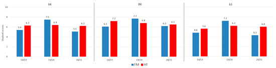 Student average marks in FM and HT, courses during the academic years: 2018–2019, 2019–2020 and 2020–2021. (a) Overall; (b) report; (c) exam.