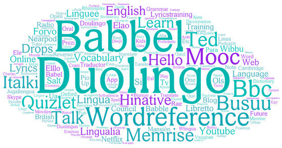 The digital applications Duolingo and Babbel were the most frequent, as they were in the previous questions of the pretest, as well as WordReference. Busuu, Memrise or Hinative were also outstanding linguistic applications [60]. Quizlet is not exactly a language app, but it does offer many educational resources. The term MOOC, BBC resources or other audiovisual content platforms such as YouTube or Netflix also appeared.
