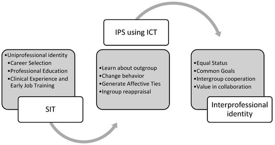 Conceptual Model of Uniprofessional and Interprofessional Identity Formation. Note: The conceptual model connects social identity theory (SIT) [19,20], interprofessional socialization framework (IPS) [16], and intergroup contact theory (ICT) [14,15,21].