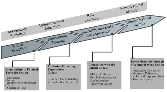 Figure 2 is an adaptation of the IPS framework developed by Khalili et al. [16] to illustrate the temporal sequence from career selection to professional training to early job experience to uniprofessional identity in the context of the themes and codes identified through thematic analysis in this study. Relevant professional socialization time points identified were career selection, professional training, and early job experience, which is congruent with the IPS framework [16,31]. Khalili et al. [16] identified media and societal influence on career selection, whereas this analysis identified participants’ personal experiences with PT as a driver of career selection. Professional training and early job experiences were critical in expanding participants’ understanding and perceptions of the physical therapy profession.