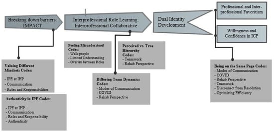 The IPS recommends early IPE in conjunction with uniprofessional education to break down barriers and provide opportunities for interprofessional role learning [16]. Figure 3 displays a modification of the interprofessional socialization framework within the context of the studied institution’s interprofessional curriculum (IMPACT Practice). Khalili et al. [16] describe an interprofessional socialization process. First, the focus is on breaking down barriers between groups and reducing stereotypes to create more equal status during professional education. Then, interprofessional role collaboration leads to a sense of belonging on the interprofessional team. Finally, individuals create a climate for equity of professional perspectives and develop a dual identity [16]. Through engagement in both uniprofessional and interprofessional curricula, participants described an increasing professional identity as a physical therapist. Participants described a better understanding of the roles and responsibilities between professions through their interprofessional curriculum, clinical education, and early job experiences (Figure 3). Participants certainly valued interprofessional teamwork and communication but may not have fully actualized an interprofessional identity in this early stage of their careers.