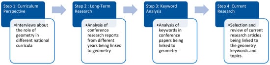To achieve this goal, a multi-stage process was chosen (see Figure 1). For the purpose of linking theory and practice throughout the article, five European experts (Italy, Slovakia, Spain, France, and Portugal) in the field of mathematics education were first interviewed about their assessment of the role of geometry (a) in the national mathematics curricula as well as (b) in research on mathematics education. We chose university professors and members that are teaching in mathematics education and have been taken part in international projects linked to practical implementations of teaching and learning of geometry. Some of them, like Spain and France, have reported a shift in their curriculum of geometry, losing relevance in comparison to earlier curriculum versions. For example, the Spanish expert, a university professor of mathematics and mathematics education, assumed that geometry averages only about 20% of mathematics in school. In the French curriculum, a tendency for geometry to be replaced by algorithmics was reported. The French interview partner, a university professor engaged in the professional development of mathematics teachers, states that most teachers do not support this evolution since geometric fundamentals are missing in other topics as well. This impression is strengthened through the role of geometry in [3], addressing the question What may mathematics education prepare students for in the society of the future? Within the article’s text (excluding references), the word “Geometry” appears only four times, namely by describing the link between the different domains of mathematics, the role of space geometry in the specific context of 3D printing technology, and the idea of proof not being limited to geometry, but supported through dynamic geometry tools.