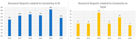 Based on these observations, we want to present an impression on the development of research activities linked to geometry in a second step. Since geometry is a topic relevant to different perspectives on mathematics education, the impression is narrowed down to the example of a psychological one. The results should not be limited to this perspective but provide a more detailed and international insight into the long-term development of one perspective on geometry. To do so, the Research Reports of the Psychology of Mathematics Education (PME) conferences for different years were analyzed to determine whether they contain a geometry-related topic. This analysis was carried out by means of the papers’ titles, abstracts, and keywords, within which we searched for the terms “geometry” and “geometric”. Deliberately, only these two umbrella terms were used at this point in order to obtain an unrestricted overview and not to unconsciously influence the focus by selecting further, more specific keywords. Thus, it can be assumed that further research reports could possibly be assigned to the field of geometry. Nevertheless, the uniform procedure for all years can guarantee that potential trends and changes can be described on the basis of the two keywords. Through the comparison of geometry-related papers and the total number of papers, we want to illustrate a general overview of geometry in mathematics education research. The results of our analysis of Research Reports from PME conferences are shown in Figure 2 and Figure 3 and reinforce the impressions gathered earlier about the declining relevance of geometry in mathematics education and related research on the long-term level. Still, with a focus on the research activities during the last five years, a generally falling trend cannot be observed. As a second intermediate result, geometry still seems to be of current relevance in mathematics education research.