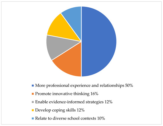 The findings in response to the prompt ’How can universities enhance initial teacher education programs to better prepare teachers in a post-pandemic world?’ revealed that half selected the statement more professional experience and relationships (50%). Other categories were selected with a similar frequency, with the promotion of innovative thinking (16%) slightly more frequently selected than other categories of developing coping skills (12%), enabling evidence-informed strategies (12%), and capabilities to relate to diverse school contexts (10%).
