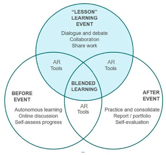 More specifically, the BL mode of competence building through AR tools provided the learners with the following: opportunities for autonomy, self-regulation, self-assessment, and online interaction with peers at the pre-session asynchronous phase of learning; collaboration, pooling of ideas, decision making, and work sharing during the synchronous sessions phase; and practice and consolidation, reflection, metacognition, and knowledge transfer to create new artifacts (ePortfolio) in the after-sessions phase. The learning instances of the intervention that facilitated the development of the abovementioned competences are illustrated in Figure 2, as adapted from [61].