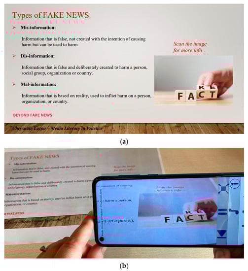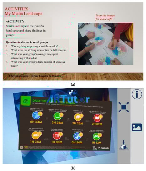 - Lazou, C.; Tsinakos, A. Exploring Augmented Reality Affordances for Media Literacy in the EFL Context. In Proceedings of the European Conference on E-Learning, Brighton, UK, 27–28 October 2022; Volume 21, pp. 449–457. [Google Scholar] [CrossRef]