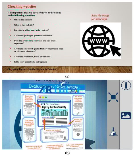 Figure 4. Augmentations with infographics, pointers, and visuals. Figure (a) displays the checklist as a text and the trigger image that leads to (b) with the overlaying digital content displayed on the app. The pointers in this figure refer to the first three questions of the checklist: cross-checking the title with the content; the byline (author), and the website/links.