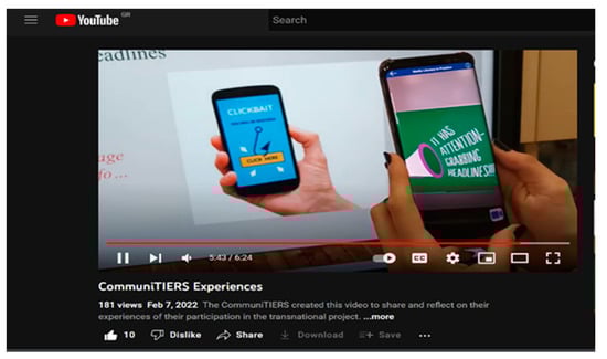 - Reflective film making. The students created a film sharing their experiences of transnational interaction, collaboration, and their learning journey, starting from the reasons for working on the specific thematic area of digital awareness based on statistics of resilience, to disinformation and types of misleading information, their media and civic engagement to share emotions, and new knowledge reflection. The film was also uploaded onto the project’s YouTube channel [66] (see Figure 7) and embedded onto the website.