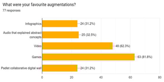 Regarding AR-specific assets that facilitated the participants’ learning and alternative assessment of both content and language and skills development (Table 2), there is a clear preference for games (81.8%) n = 63, followed by videos (62.3%) n = 48, audio explanations (32.5%) and an equal preference for infographics and wikis (31.2%), as illustrated in Figure 8. Nevertheless, 16 students stated only a single AR media preference. More specifically, 13 students showed no preference for games despite the high-score general preference, and 6 students out of the 13 stated that the auditory augmentations facilitated their learning process more and that they would like to have more AR audio assets included in their materials. There was no age, nationality, or linguistic competence correlation between these participants’ demographics, which proves the need to respond to multiple means for the representation of content according to learning styles and needs as dictated by the UDL principles.