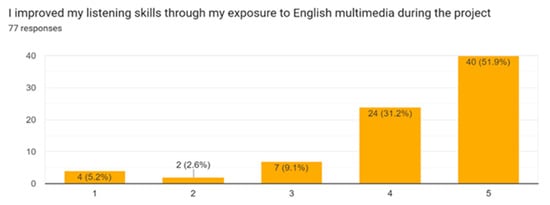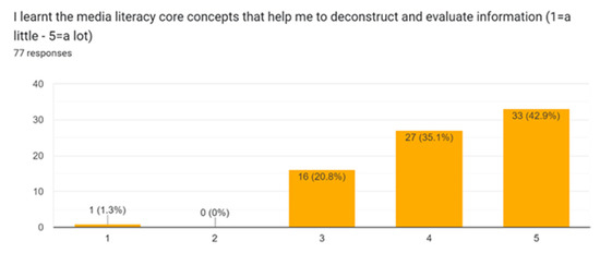 With regard to critical digital skills development, the participants’ response on the usefulness of the auditory augmentation on the media literacy core concepts yielded the following results, as illustrated in Figure 9: 78% of the participants (n = 60) stated a high score of usefulness, with 16 participants registering answers in the middle of the scale, and 1 participant stating “a little”. In the open questions option, it was noted that the participants stressed the importance of the auditory augmentations as a simulation of a one-to-one tuition opportunity in an asynchronous mode with the affordance of listening to their instructors’ familiar voice as an important element of delivery of content in a personalized learning instance.