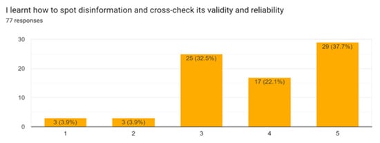 As aforementioned, AR infographics with pointers, visuals, and color cues, and AR-based gamification facilitated the spotting of disinformation and the development of the participants’ critical digital literacy skills. The participants, based on measurable and observable criteria, that is, (a) their experiences during the intervention, (b) the self-checking assessment, and (c) the feedback received from their peers and instructors, were asked to state their self-evaluation on new knowledge and skills. As depicted in Figure 10, these measurable results bring a wider range of responses. More specifically, despite the participants’ observable progress, with only six participants stating not much progress in identifying quality information in the digital world compared to course pre-tests, 22.1% (n = 17) and 37.7% (n = 29) had a better or much better performance, respectively. A considerable 32.5% (n = 25), which accounts for one-third of the participants, made sufficient progress but did not reach high-performance scores.