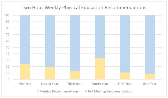 The average physical education teacher-to-student ratio was 1 teacher to every 180.38 pupils. A total of 27.7% of schools implement Leaving Certificate physical education, while 51.8% have no plan to implement. Two thirds of schools last received a Department of Education physical education inspection 6–10 years (37.5%) or 11–15 years (31.3%) ago. Three in five schools (61.6%) indicated there was no formal classroom-based classroom assessment of Junior Cycle physical education, while just 12.5% indicated that there was formal classroom-based assessment of Senior Cycle physical education. A total of 75.9% of first years, 80.4% of second years, 87.5% of third years, 66.1% of fourth years, 89.3% of fifth years and 92% of sixth years failed to meet the Department of Education physical education recommendations (2 h weekly). Junior cycle physical education is compulsory for 99% of class groups, while Senior cycle physical education is compulsory in 86% of class groups. On average, 39% of schools indicated that 10% of more of senior cycle students did not regularly participate in physical education class. At least one in every three schools indicated that physical education did not enjoy a similar status to other subjects in the school (36.5%), and physical education classes were more likely to be cancelled than other subjects (38.4%). A detailed description of the physical education activities with the highest and lowest provision, and the range of activities provided, are summarized in Table 3. Figure 2 illustrates the percentage of pupils meeting the Department of Education physical education recommendations by year group.