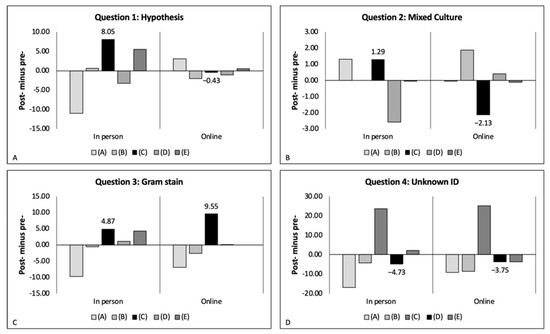 In the final written report for the BUIP, students are expected to provide their hypothesis; therefore, we surveyed whether students could select a correct hypothesis out of four provided options. While we observed no significant difference in the students’ improvement in identifying a correct hypothesis between the two semesters, there were still notable shifts (Figure 2A). Students in the in-person semester had an 8% improvement in their ability to identify a correct hypothesis when compared to students who completed the project online, where there was no change in student responses.