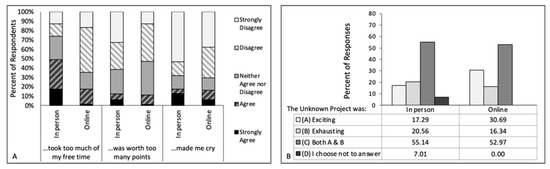Self-reported student perceptions and engagement. Self-reporting of project engagement indicates students had greater positive outcomes when the class transitioned online. Questions regarding student engagement with the project were determined through either (A) a Likert scale reflecting the perceived difficulty of the project or (B) a multiple-choice question reflecting the excitement or exhaustion of the project. For both the Likert scale and multiple-choice question, there was a significant shift in students’ engagement with the project across both surveyed semesters (chi-square analysis, p-value < 0.05).