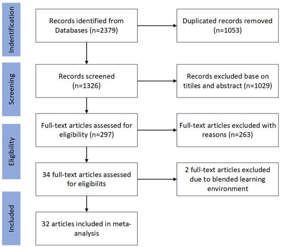 The study used a checklist and a flow diagram from PRISMA guidelines to help us improve the quality of systematic reviews. The specific literature screening process is shown in Figure 1. To examine the effect of scaffolding for students’ online learning performance, we applied the following criteria to select articles for our analysis: (1) the research topic is about the effect of scaffolding on students’ online learning performance; (2) the studies were conducted between 2011 and 2021; (3) the studies were written in English; (4) the study design was either experimental or quasi-experiment; and (5) complete research data should be reported, such as sample size, mean, and SD, so as to facilitate the calculation of effect size. A total of 2379 articles were screened out in the initial search. After excluding the articles that do not meet the screening criteria, a total of 32 articles met the requirements.
