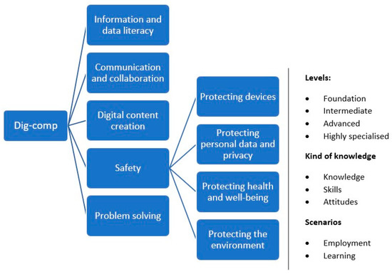 Likewise, DIGCOMP is a digital competence framework created by the European Commission, which proposes a set of digital competences for all citizens. The DigComp framework creates an agreed vision of which competences people need to overcome the challenges of digitization in almost all aspects of modern life [20]. It aims to create a common language that can be used in tasks ranging from policy formulation and goal setting to planning, evaluation, and monitoring of teaching.
