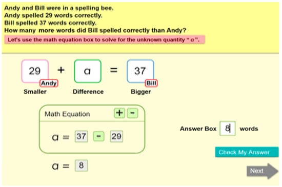 As the outcome of collaborative work from mathematics education and special education, we have developed, with the support from the National Science Foundation (NSF, [22]), a web-based computer tutor that emphasizes the teaching of big ideas in additive word problem solving. Specifically, the MBPS program emphasizes the nurturing of fundamental mathematical ideas, for instance, the conception of “number as a composite unit.” According to Steffe et al. [23], the concept of the composite unit is the primary cognitive structure that underlies a child’s conceptualization of all additive part–part–whole problem situations. When a number is conceived of as a composite unit, a child can join a unit of 3 and a unit of 4 to compose a larger unit of 7; they can also break or decompose 7 into 3 and 4 (or 1 and 6, 2 and 5, 4 and 3, 5 and 2, and 6 and 1). With this composing and decomposing scheme, the child will be able to understand the part–part–whole (PPW) conceptual model [24]. The MBPS computer tutor was designed to specifically support the development of number concepts such as the composite unit, which would naturally lead to the big idea in additive reasoning; that is, part and part makes up the whole (P + P = W). Students were not required to identify whether the problem fit a specific problem schema (e.g., combine, or change–join in, change–separate), and the decision on the operation was not determined by the identification of the specific problem schema. Rather it was determined by the mathematical model equation (P + P = W) and the correct representation of the mathematical relation in the model equation.