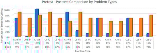 Based on the data from the group design study [22], the participating students significantly improved their performance from an average of solving 5 (out of 14) problems correctly during the pretest to an average of solving about 10 problems correct on posttest. As the purpose of this specific study was on the error pattern or success rate of participating students in solving a range of additive word problems (a total of 14 variously constructed problems as shown in Table 2), Figure 2 presents the percentage of students who solved each of the problems correctly before and after the intervention (the problem type is noted at the bottom of the bars; please refer to Table 2 for the coding of each of the problem types).