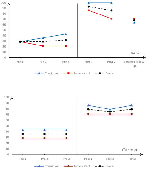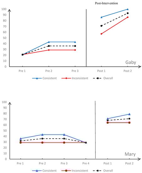 Figure 3 presents four participants (Carmen, Gaby, Mary, and Sara, see Table 1b for their demographic information) from the MB design study, which shows students’ performance change from baseline to post-intervention phases. We calculated the percentage correct in solving seven consistent language problems (7 out of 14 problems, the line graph in blue color) separately from the percentage correct in solving inconsistent language problems (the other seven problems, the line graph in red color) to examine different potential patterns of participating students’ ability to solve these problems before and after the intervention. The black dash line represents the overall performance, percent correct on solving all 14 additive word problems.