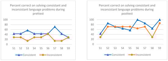 Figure 4 presents nine students in the group design study and their performance (% correct) in solving consistent and inconsistent language problems before and after the intervention. Again, we calculated the percent correct on solving consistent language problems (7 out of 14 problems, the line graph in blue color) separately from the percent correct when solving inconsistent language problems (the other seven problems, the line graph in red color) to examine potentially different patterns of participating students’ ability to solve these problems before and after the intervention. As shown in Figure 4 (left panel), it seems that there is a relatively clear patten/separation in terms of student performance in solving consistent and inconsistent language problems. Specifically, seven out of nine students (78%) performed better in solving consistent language problems when compared to inconsistent language problems. This finding is supported by existing literature in that students experience more challenges in solving inconsistent language problems [19]. However, after the intervention, it seems that the separation of the two lines becomes blurred or indistinct; in fact, there is an interaction between the two data paths.