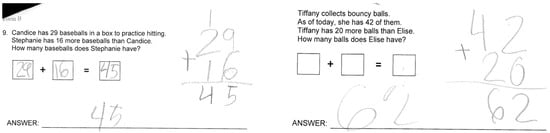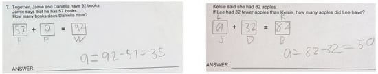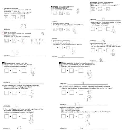 The findings from this study seem to indicate that the MBPS intervention promoted students’ success in solving most of the problems except for the two problem situations, the change–join problem with the ending total (or whole) as the unknown (i.e., CJ-WE) and the change–separate with the beginning amount (whole) as the unknown (i.e., CS-WB). Upon careful examining students’ work in pretests, it was discovered that, during the pretest, most of the participating students simply took two numbers given in the problem and applied the same operation (e.g., adding) to achieve the answer, regardless of how the word problem was constructed and/or the mathematical relations described in the problem. This is supported by previous research in that students added all the numbers in the problem to solve problems (i.e., the “add-all” strategy, [19]). Figure 5 presents examples of how the participating students applied “adding the given two numbers in sequence” to solve all the problems.