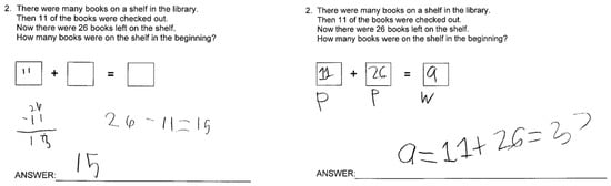Similarly, for the change–separate problems with the beginning amount (the “total” or “whole”) as the unknown (CS-WB, see sample problem #2 in Figure 5), most participating students (89%) got the correct answer during the pretest because adding the two given numbers would “win them the luck” although the “beginning amount unknown” problems were considered rather challenging for many students (Parmar et al.,1996). After the intervention, it seems that the participating students have yet to master the newly learned strategy (56% of the students solved this problem correctly). Figure 6 shows participating students’ work on solving this problem during the posttest. As shown in Figure 6 (left panel), the student did not engage in representing information in the PPW diagram equation; rather, they just applied an operation for the answer. It seems that the student reverted to the old strategies they had (e.g., the keyword strategy, “books checked out”—subtract!), resulting in an incorrect answer. In contrast, as shown in Figure 6 (right panel), this participating student used labels to anchor the representation of the three essential elements (i.e., P, P, W) in the PPW diagram equation and then solved the problem correctly.