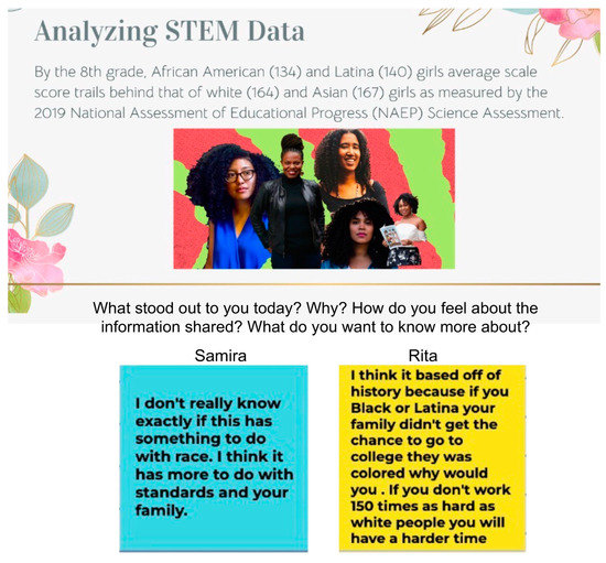 Loving Critique and Reflexivity (CSP): By building trusting and intentional learning spaces, the girls engaged in open dialogue and provided loving critique that challenged discourse that perpetuated racialized and gendered oppression. During this particular day at camp, Laura and Shae facilitated a STEM activity and conversation around girls’ achievement in science. They analyzed data on the representation of girls in science that was disaggregated by race and ethnicity. This led to lively and thought-provoking conversations amongst the girls. Of particular interest was dialogue generated as they analyzed the 2019 National Assessment of Educational Progress (NAEP) Science Assessment scores. Laura shared the prompt and students reflected on what stood out to them during the session, their reactions to the presented information, and any areas they would like to explore on a deeper level. See Figure 3 for Rita and Samira’s jamboard responses followed by an excerpt of their exchange.