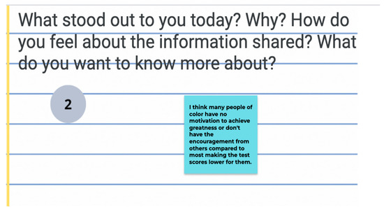Intentionally cultivating a learning community that welcomes loving critique provided a safe space for Samira to express her dissenting views, which were met with resistance from Rita. Subsequently, Rita took the initiative to elucidate her perspective by drawing on her own lived experiences, thereby offering Samira an enhanced understanding of her position. Samira’s position was that race did not influence the discrepancy in test scores amongst eighth grade girls across racial and gender lines; she attributed it to familial standards, whereas Rita discussed the importance of considering historical underpinnings and the residual effects across generations. She specifically shared how her mother, grandmother, and even great grandmother had to fight for opportunities and if you are a Black woman in America, you will experience racial discrimination and racial profiling. Samira asked a provocative question that must be given consideration—“what does race have to do with school?” She was perplexed by the role of race on what was supposed to be a standard assessment. Standardization must be critiqued because there is a human factor involved that cannot be ignored. Rita discussed the history of enslavement and how that would come to bear during assessments because of the daily torrents that Black girls and women face. Rita wrote on the jamboard that Black girls and Latinas must work 150 times as hard as White people to experience success. She also made connections to generational wealth and how financial stability influences one’s academic outcomes.
