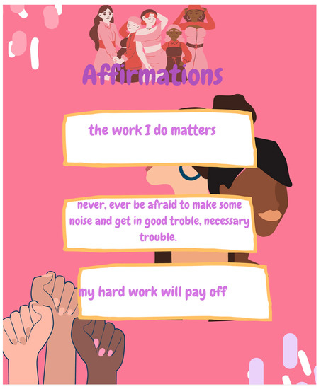 In sustaining their lives and revitalizing souls, we worked against spirit murdering that they are subjected to within formal schools [20]. Historically, Black children have been perceived as being biologically and culturally deficient and lacking biological traits to be successful in the school system [49,50]. Another taken-for-granted truth is that the Standardized Aptitude Tests are objective and children of color do not have the same intellectual capacity as their white counterparts giving the perception that people of color are not working hard enough or pulling themselves up by the bootstraps in order to achieve the American Dream [51,52]. The ideology of the American Dream is a myth because meritocracy assumes that all individuals are given the same opportunities to succeed based on their merit [53]. The damaging effects of White supremacy and these master narratives have led many to believe that Black children are racially inferior. Sadly enough, many Children of Color have internalized these feelings of racial inferiority [52]. Black girls are regularly portrayed as inferior and a problem to society and schools [27]. Racial hierarchies have been maintained by ideologies of white supremacy and become evident in performance outcomes on national assessments. A defining feature of “inherent superiority” has been used to justify power and the “right to dominance” [54]. To revitalize their souls, and the souls of other Black and Brown girls, Brandy and Joy wrote affirmations. They displayed responsible decision making in moving beyond the conversation on the source of motivation to creating a solution to help with the problem—positive affirmations. The literature reveals that racial microaffirmations promote wellbeing for Students of Color and serve as protective factors against microaggressions [55].