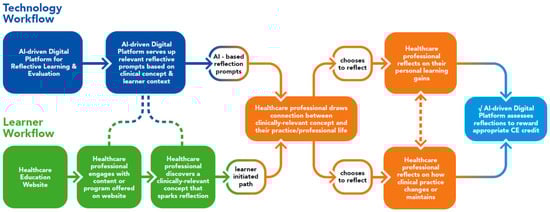 As outlined above, reflective learning can help healthcare professionals determine how evidence-based innovations can be applied in their clinical practices and can also support interprofessional education. To leverage this, an existing AI-driven digital platform for reflective learning was trialed through a current healthcare education website in December 2022. A diagram outlining the technology and learner workflows of this pilot trial is provided in Figure 2.