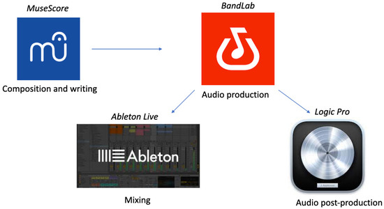 At the operational level, the collaborative composition is structured around the sequencer use of an online music text editor (MuseScore), the audio production on a freely available online DAW such as BandLab, and optionally post-production of the product at the mixing and effects level on a professional DAW such as Logic Pro or Ableton Live (