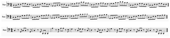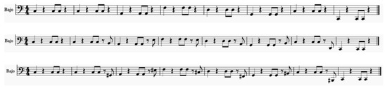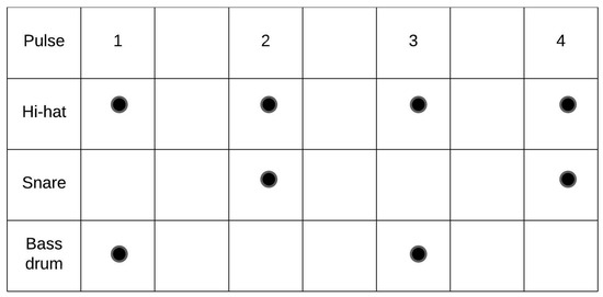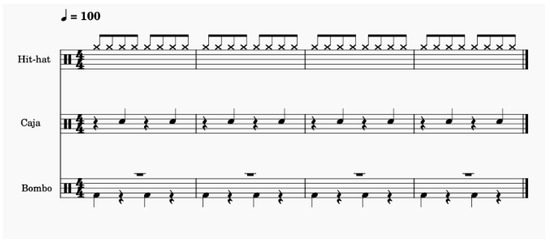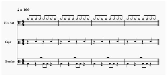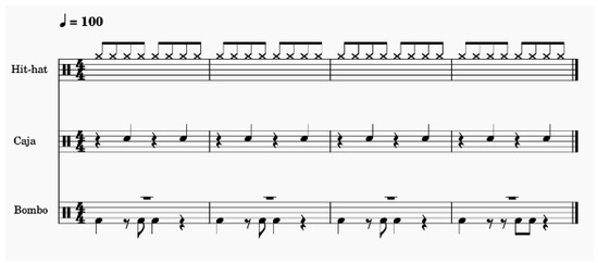 Figure 2) with the bass drum on beats 1 and 3 and the snare drum with shifted accents on beats 2 and 4, and the hit-hat marking all beats (quarter notes). From this structure, variations in the bass drum, snare drum, or “hi-hat” can be sequentially exemplified, analyzing their impact on the perception of the groove or directionality of the musical discourse.