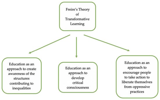 Paulo Freire’s theory of transformative learning focuses on providing learners with the ability to analyze situations so that they can take action to liberate themselves from oppressive practices. This form of learning emphasizes raising awareness of the structures that contribute to inequalities [14]. Freire rejected the passive exchange of knowledge that exposes learners to content disconnected from their experiences. Such an approach promotes a power imbalance between teachers and students. Instead, he advocated for an education that requires teachers to collaborate with learners, allowing them to gain the knowledge needed to free themselves from oppressive structures [15]. Freire’s ideas were originally implemented in Latin America and Africa. These ideas have spread to other parts of the world [14]. Figure 1 and Figure 2 show some of the concepts associated with social reproduction theory and Freire’s theory of transformative learning, respectively.