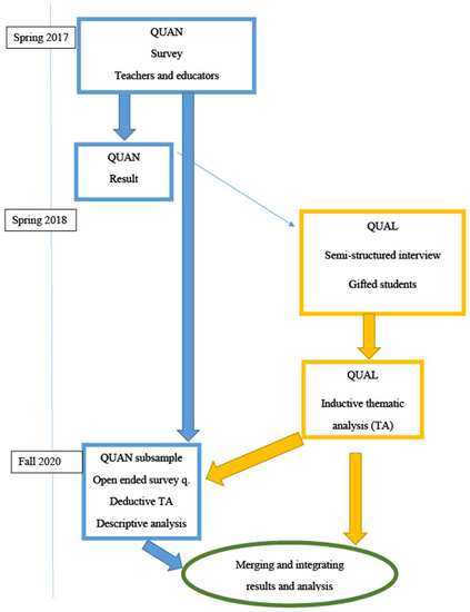 This study investigated adaptation and facilitation for gifted students in Norway. We used a convergent mixed methods design to understand adapted education from both the teacher and student perspectives. The overarching research question guiding this research—How is education adapted for gifted students in Norway?—was supported by the following quantitative, qualitative, and mixed methods sub-questions: