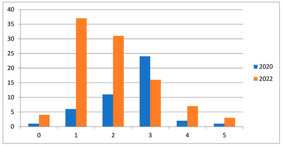 Figure 3 and it ranges from 0 to 5. There were no events in only 1 chat in 2020 and in 4 chats in 2022. Only 1 event can be noted in 6 chats of 2020 and 37 chats of 2022, 2 events in 11 chats of 2020 and 31 chats of 2022, and 3 events in 24 chats of 2020 and 16 chats of 2022. Further, 4 events occurred in 6 chats in 2020 and 37 chats in 2022, and 5 events in just 1 chat in 2020 and 3 chats in 2022. Chats in 2020 have more events, most often it is 2–3, while chats in 2022 have fewer events on average at 1–2, which most likely correlates with the decline in the activity of including parents in the educational process after the abolition of online education in schools.