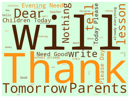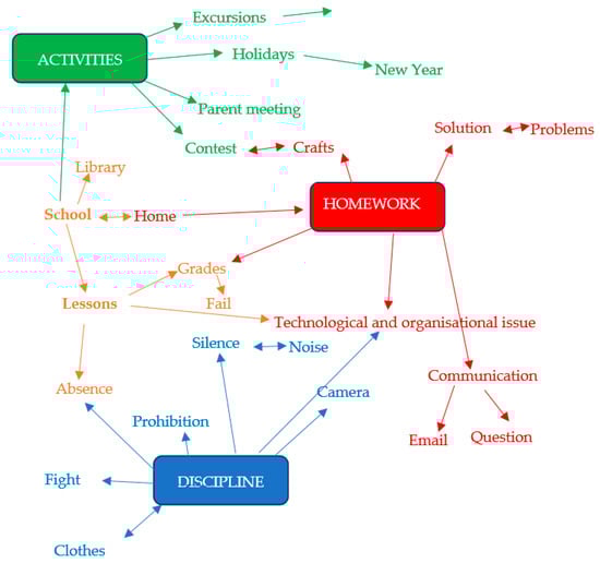 Figure 4). In other words, the parents themselves, their actions, etc., are almost never the subject of chat discussions except for the communicative actions that take place in the chat, that is, the messages sent directly, their themes, style, etc. The main topic of chats is what happens to children in connection with school: the school itself, the actions prescribed by the school (including homework), the consequences of school events, etc. The student is a direct participant in the process, but cannot fully protect their interests. Most often mothers participate in the chats, but they act as representatives of the family, sometimes using indirect speech, conveying the opinion of the children or the husband.