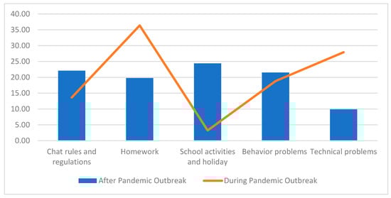 Figure 7), and more participants became involved in communication than in the normal period. During the normal period, the four main topics occupy about equal space in chats: chat rules and regulations (22%), homework (20%), school activities and holidays (24%), and behavioral problems (24%), while technical problems (usually related to e-diary work) occupy 10%. During the e-learning period the emphasis shifts. Discussions of activities and holidays lose relevance, as there is a period of self-isolation. Questions are asked only about the future, for example, whether there will be a graduation party at the end of the school year (3%). Questions about homework (which is difficult to distinguish from class work during the pandemic) become the most relevant for the chat —36%—with technical problems coming in second place—28%. Behavioral problems usually only come up during the pandemic from the teacher as opposed to in post-pandemic time—19%. Since the children were at home, the teacher required the parents to make sure the children followed the prescribed behavioral norms, which demonstrates a partial role reversal.
