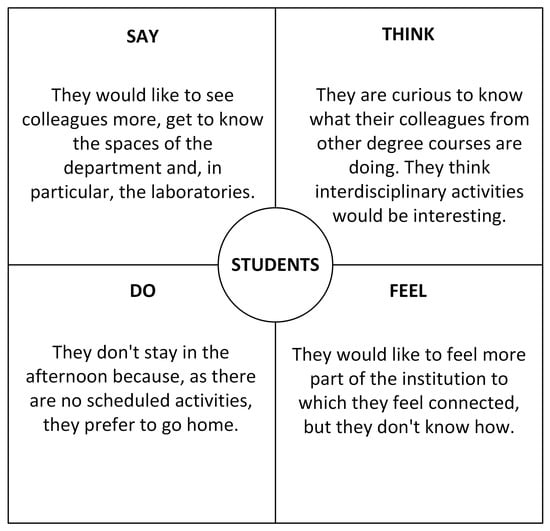 With the organization of university studies which, in Italy, has led to scheduling lessons mainly in the morning, it has been noticed that students stay less and less in department rooms. In order to encourage socialization, teamwork and a sense of belonging to one’s university, sporting, recreational and recreational–didactic initiatives have been launched in our department. With reference to the latter, given their particular importance, being recognized as educational activities that contribute to educational careers, some events were decided to be organized after consulting the student representatives. With their contribution, an empathy map was drawn up to understand what the students’ wishes were. The map is reported in Figure 1.