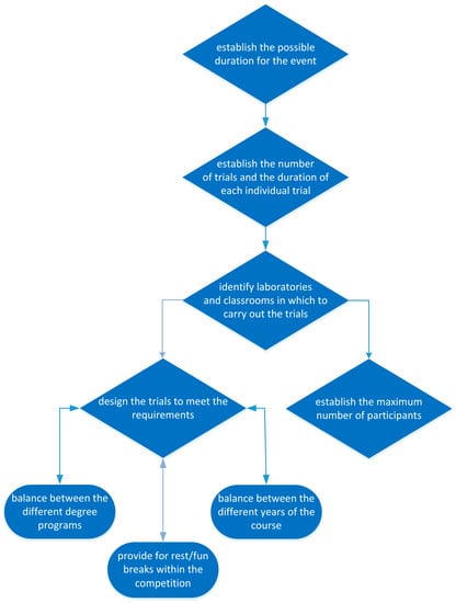 To organize the game, the procedure outlined in Figure 2 was followed. Once the duration of the game had been established (a whole afternoon), it was determined how many trials would be carried out and how long each trial would last. Then, based on the availability of the teachers and the availability of the structures, we moved on to organizing the tasks. For the easy management of student access to the department structures and in consideration of the duration of the game, we decided to set the maximum number of participating teams at 20, for a maximum of 120 students. We did not fix the number of members per team in a rigid way, but preferred to keep a range of 4–6 members, to aid the students at an organizational level. In organizing the tasks, three objectives were considered: to ensure a balance between the different degree courses, to ensure a balance between the different years of the courses, and to ensure moments of relaxation or fun to break the tension of the competition. To meet such requirements, the actions reported in Table 1 were put into practice.